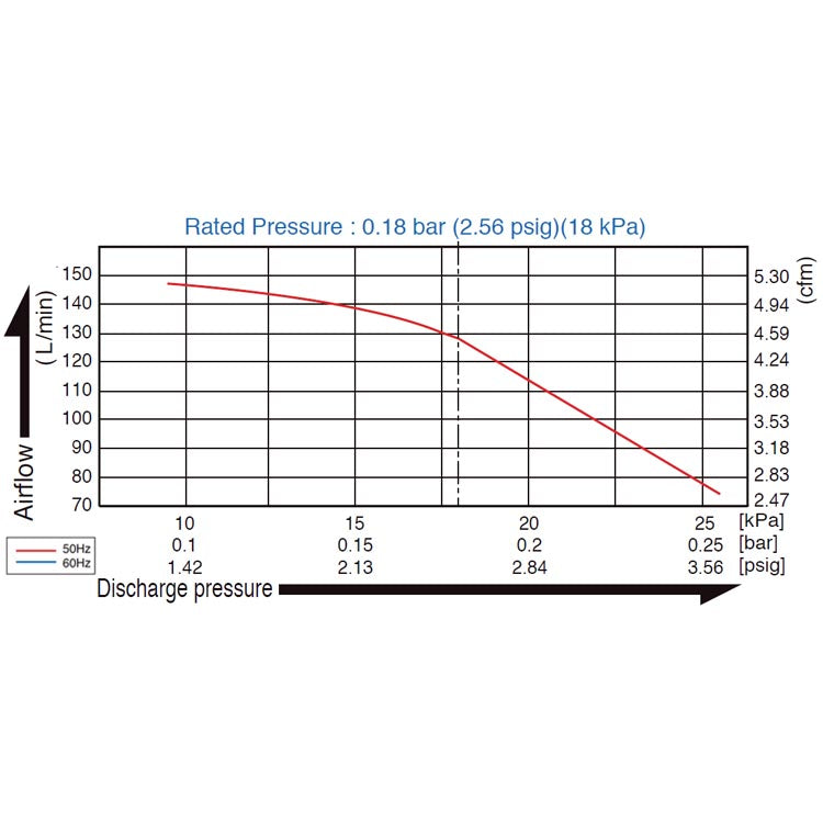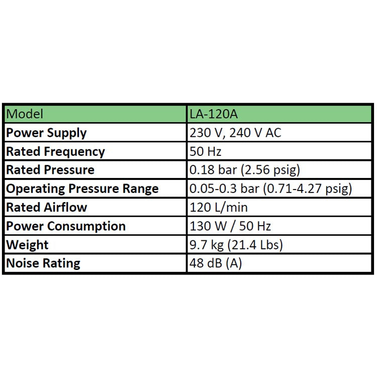 - Produces: 120 l/m @ 180 mbar